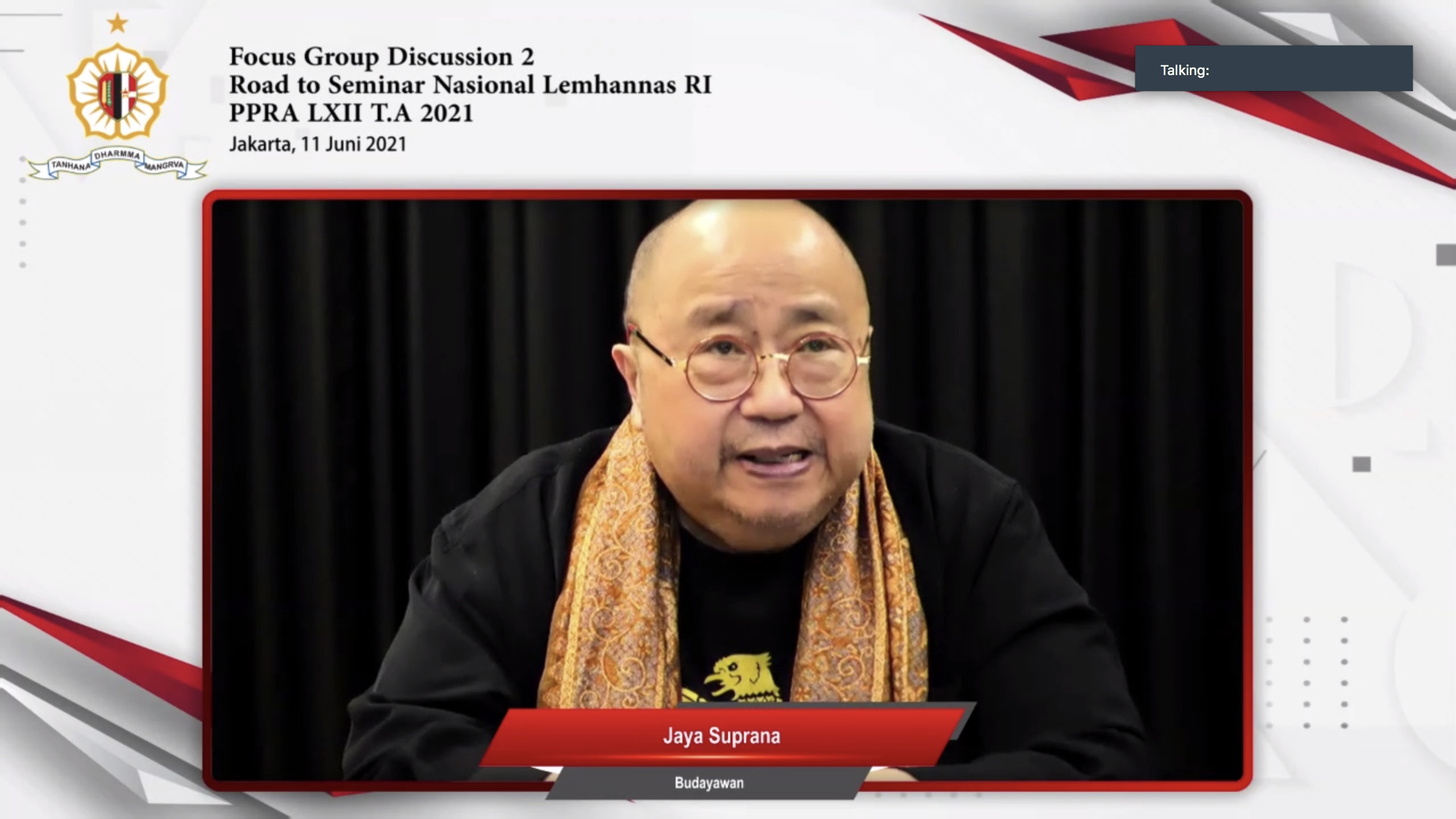 Setelah melaksanakan Focus Group Disscussion (FGD) I pada Jumat, 28 Mei 2021 yang lalu, peserta Program Pendidikan Reguler Angkatan (PPRA) 62 Lemhannas RI kembali menyelenggarakan FGD II sebagai salah satu rangkaian Seminar Nasional PPRA 62 Lemhannas RI mendatang yang mengangkat judul Modal Sosial dan Budaya Menjadi Kekuatan Nasional dalam Pemulihan Ekonomi di Tengah Pandemi Covid-19. FGD II tersebut masih dilaksanakan secara virtual dan dihadiri empat pembicara, yaitu Wakil Asisten Teritorial Kasad Bidang Perencanaan dan Kemampuan Teritorial Brigjen TNI Sugiyono, Executive Vice President of Digital BLIBLI.COM Andreas A. Pramaditya, Staf Ahli Menteri PPN Bidang Sosial dan Penanggulangan Kemiskinan Dr. Vivi Yulaswati, M.Sc, dan Budayawan Jaya Suprana.