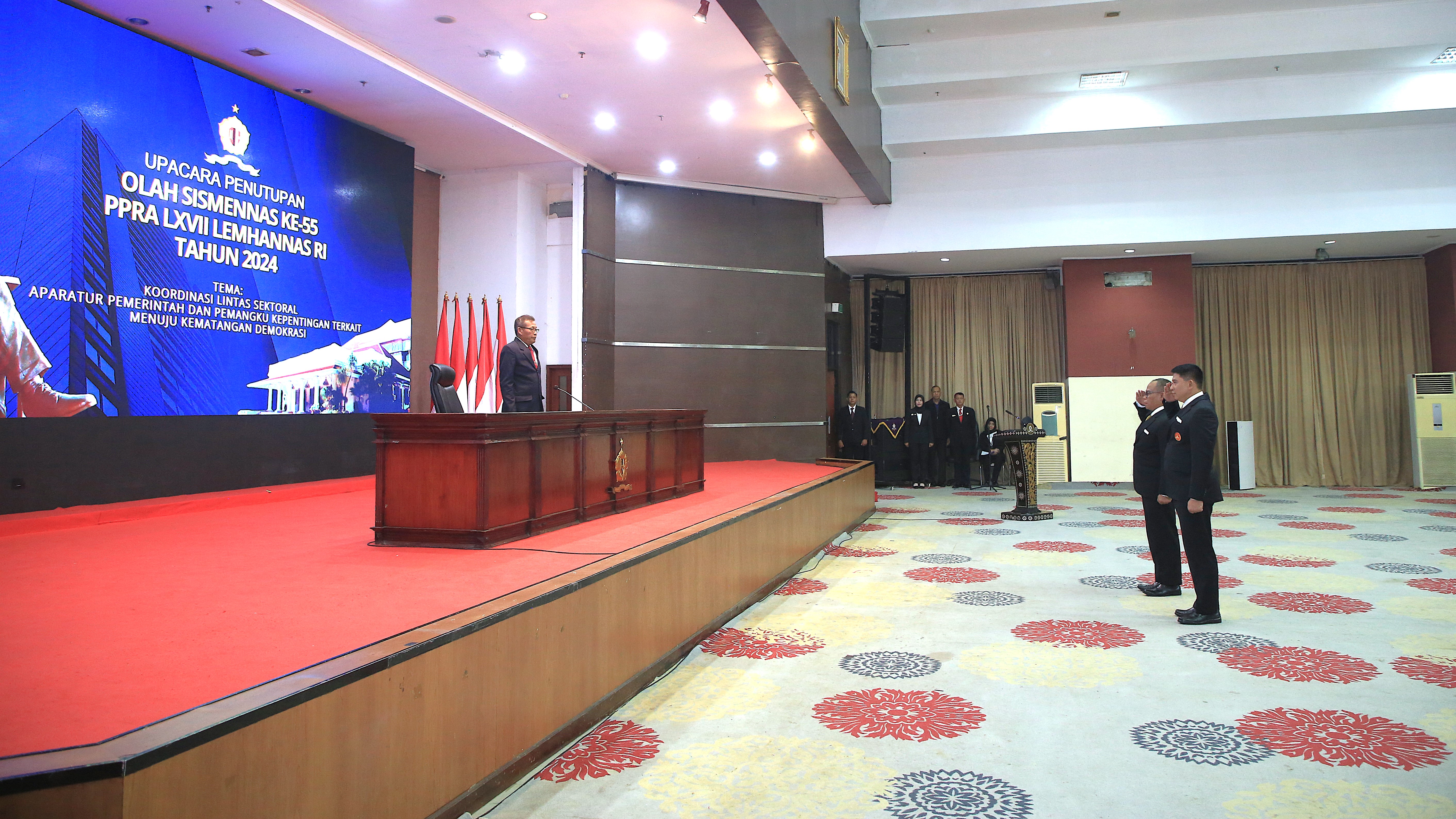 Pelaksanaan Olah Sistem Manajemen Nasional PPRA 67 Lemhannas RI dengan tema Koordinasi Lintas Sektoral Aparatur Pemerintah dan Pemangku Kepentingan Terkait Menuju Kematangan Demokrasi yang berlangsung selama empat hari sejak 8 Oktober lalu, resmi ditutup oleh Deputi Pendidikan Tingkat Nasional Marsda TNI Andi Heru Wahyudi di Ruang Dwi Warna Purwa, pada Jumat (11/10).